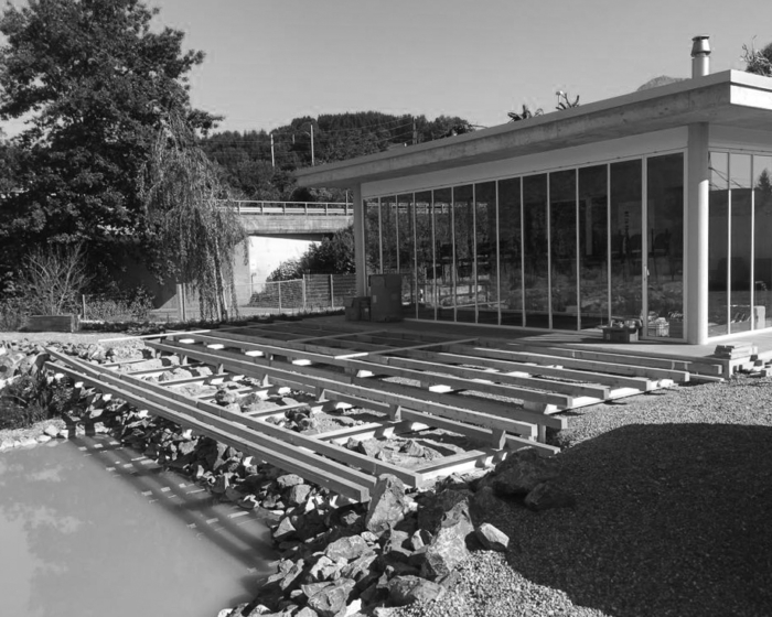 Unterkonstruktion aus HEA-Trägern, Balkenlage aus Berglärche, Terrassenboden